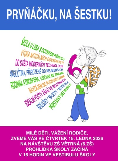 Ve čtvrtek 15. ledna 2026 se v 16 hodin mohou budoucí prvňáčci s rodiči přijít blíže seznámit s naší školou: